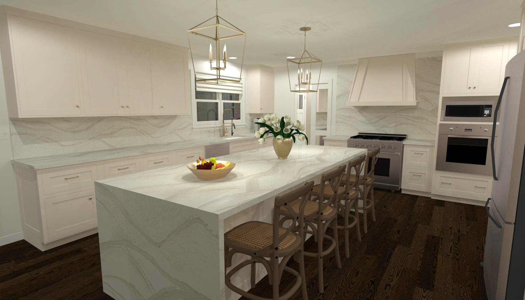 To keep costs down, Shelly’s team focused on leaving utility hookups in the exact locations and utilizing these appliances as focal features to balance the space. A new entrance was added, so multiple entrance/exit points are available, creating a better flow through this area of the home. By straightening it out and adding some old Chicago brick for texture, Shelly was able to save a portion of the existing curved wall. The kitchen style is relatively simple, with a neutral color pallet. She included accents of gold hardware and a clean, simple waterfall island that serves as a functional storage space for kitchen items and seating space for entertaining. The quartz material on the island was also utilized as the backsplash.