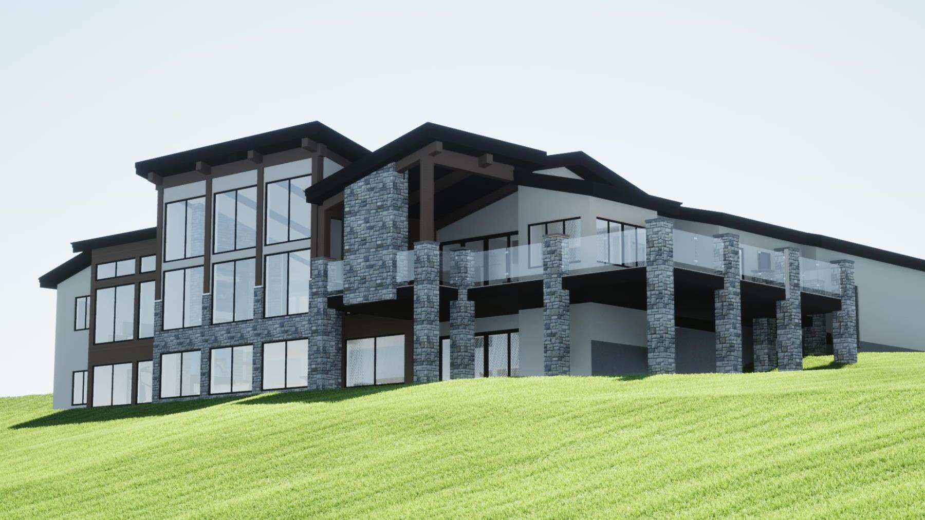 Vince of Homes by Design Innovations created an exquisite design that is currently being built on 10 acres in Alberta, Canada. It is 3800 square feet and includes a walkout bungalow. His clients wanted a mountain lodge feel with a modern twist. The great room on the main floor has an 18-foot high sloped ceiling, large windows, and faux beams.