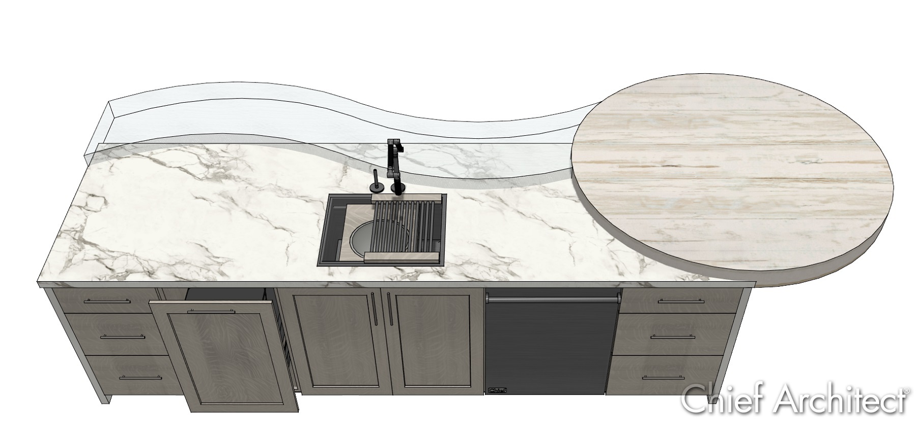- Smart Countertops & Backsplashes: Countertops and backsplashes generate automatically when you place cabinets, and they’re easy to customize to any shape, size, and materials for a perfect fit. With a click of a button you can add overhangs, waterfalls, and more. You can even draw a unique custom shape using 2D CAD and convert it to a 3D countertop or backsplash.