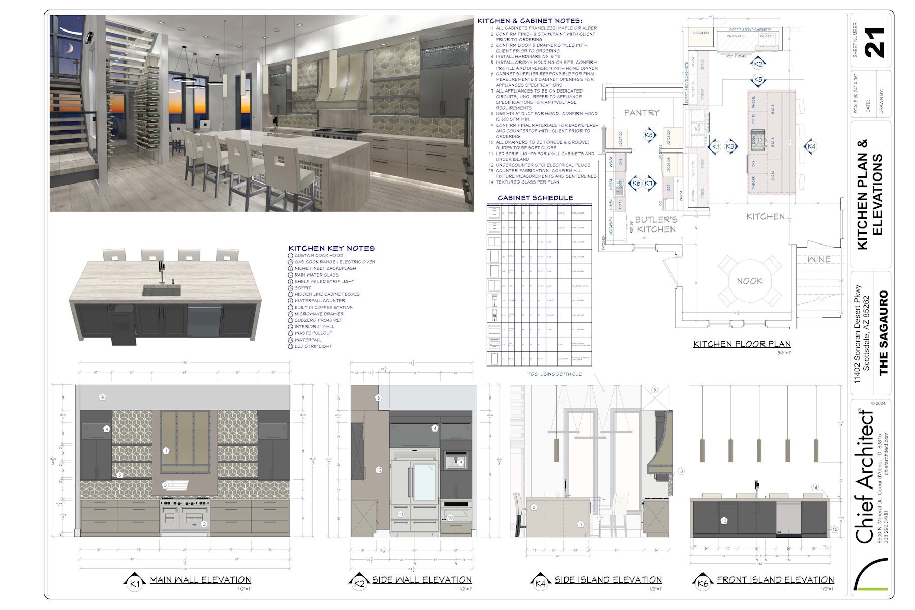 - Automatic Interior Schedules: Chief Architect automatically generates detailed schedules for interior elements like cabinets, countertops, fixtures, furniture, appliances, and more—complete with detailed information about the object, as well as labels and callouts that correspond to your floor plan, making documentation fast, accurate, and professional.