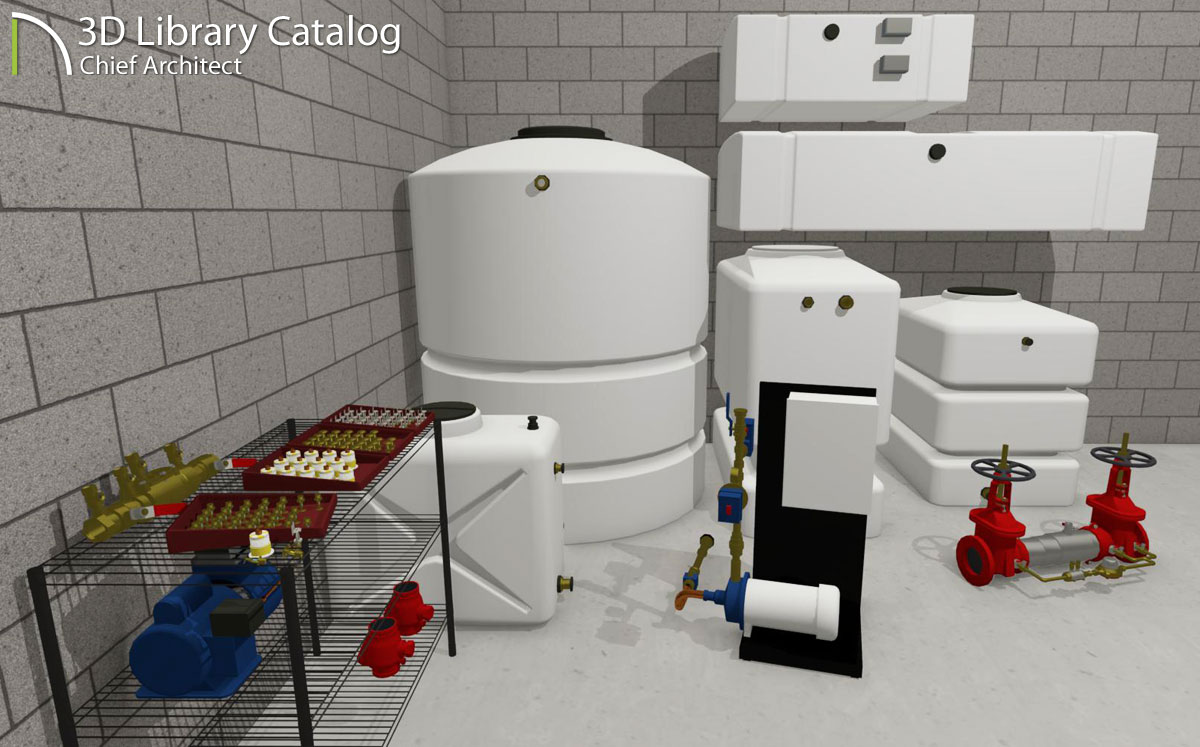 Find sprinkler heads, compressors, water storage tanks, and valves for specifying home fire sprinkler systems. Sprinkler heads will place near the ceiling when inserted in Plan View. Chief Architect Users can leverage molding polylines with a round profile to create the pipe connections between components.