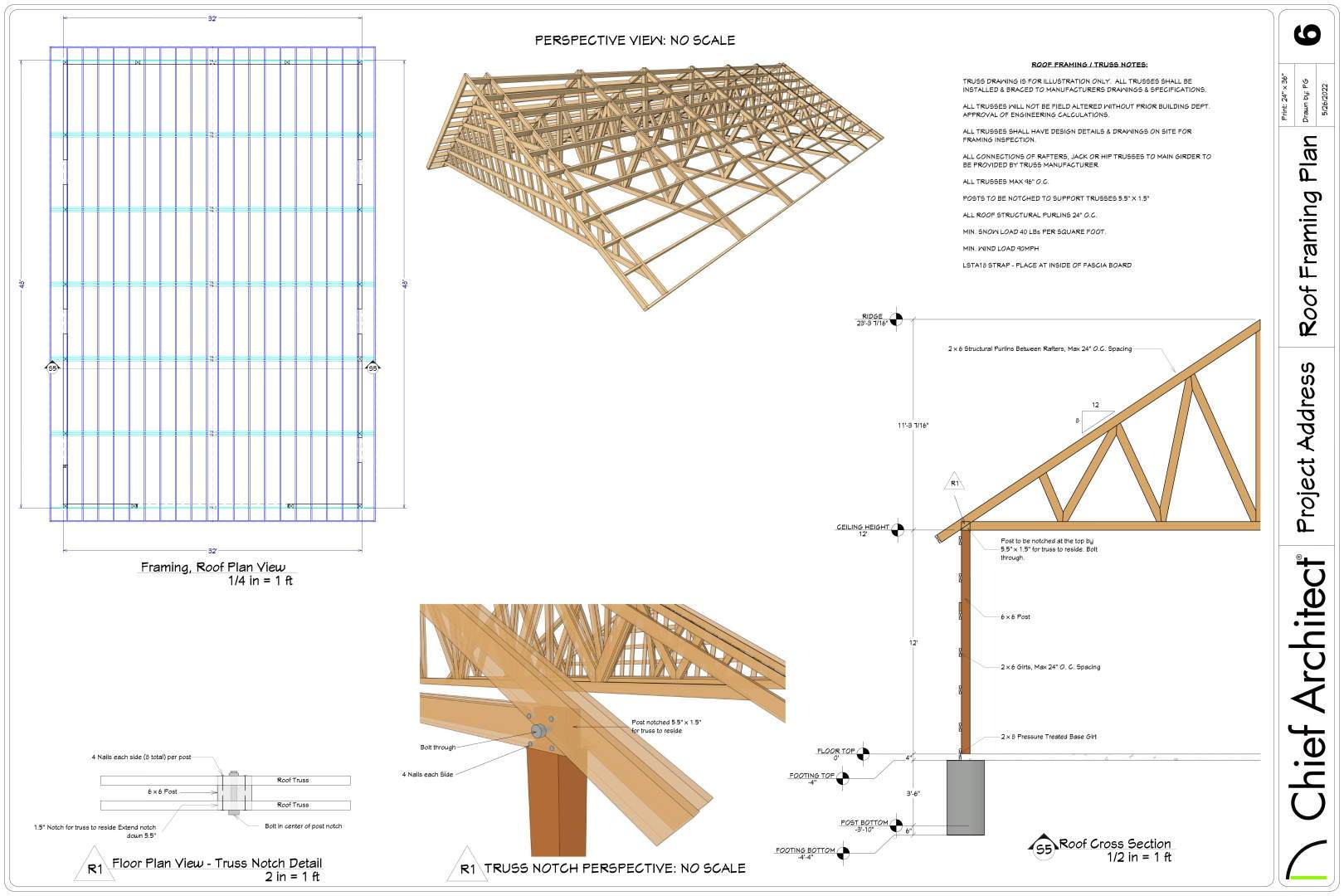 Knowing how a structure will be framed is critical for any design. Chief Architect Premier can automatically place posts and girts to your specified size and spacing. When adding roof trusses, the trusses automatically span the width of the roof planes and add webbing. Purlins can be generated on top of trusses or rafters, and structural purlins can be generated between trusses or rafters. All framing can be shown in a framing detail, framing schedules, material lists, and more.